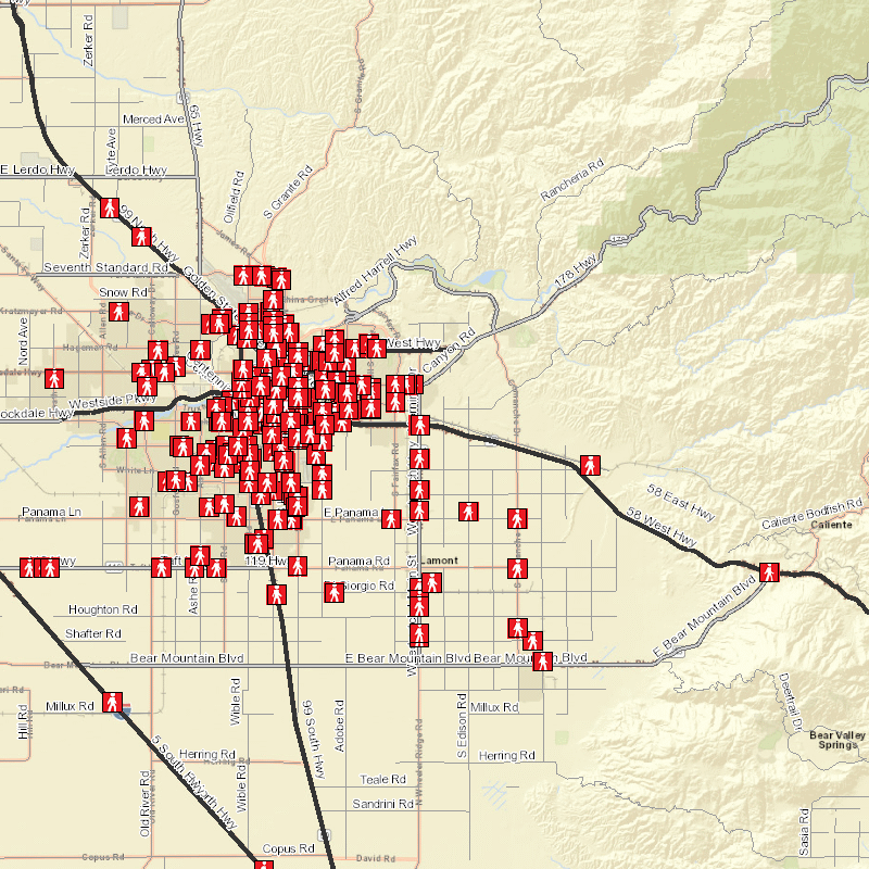 Web map detailing the pedestrian and bicycle collisions and fatalities in Kern County over the past 10 years.